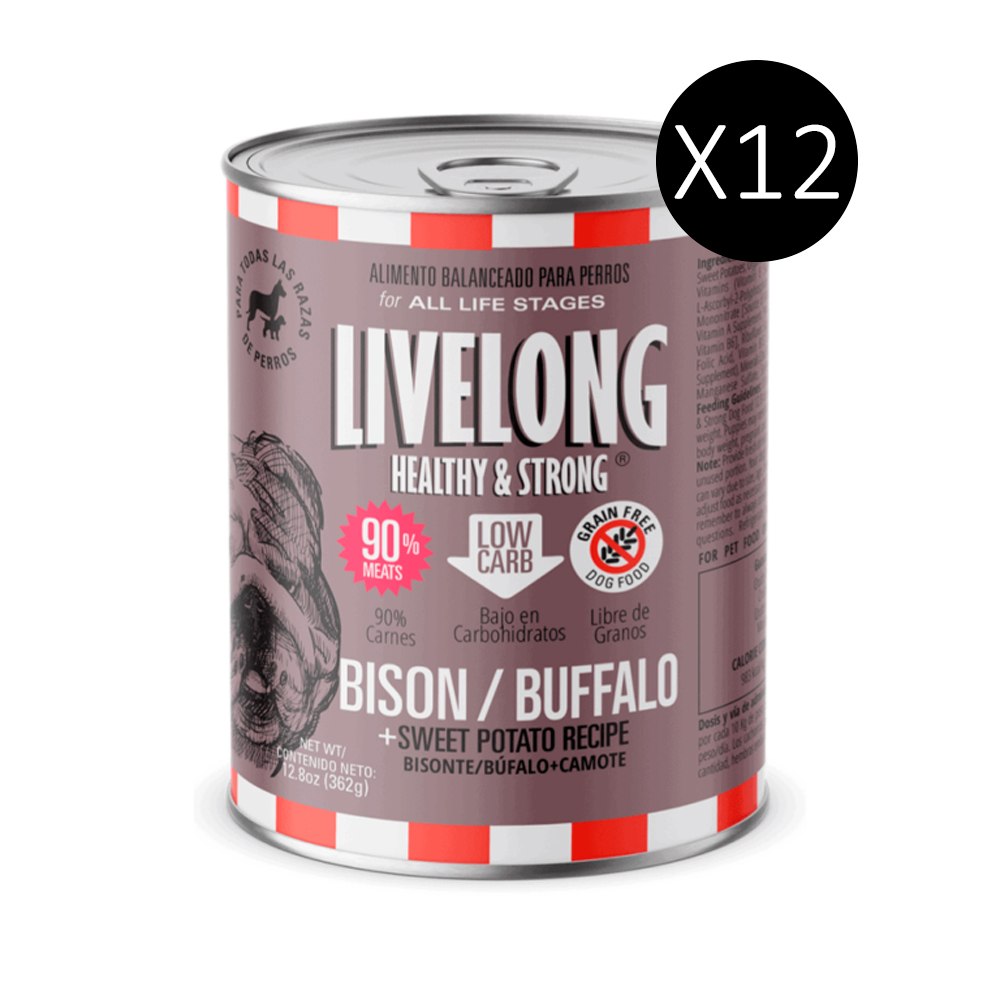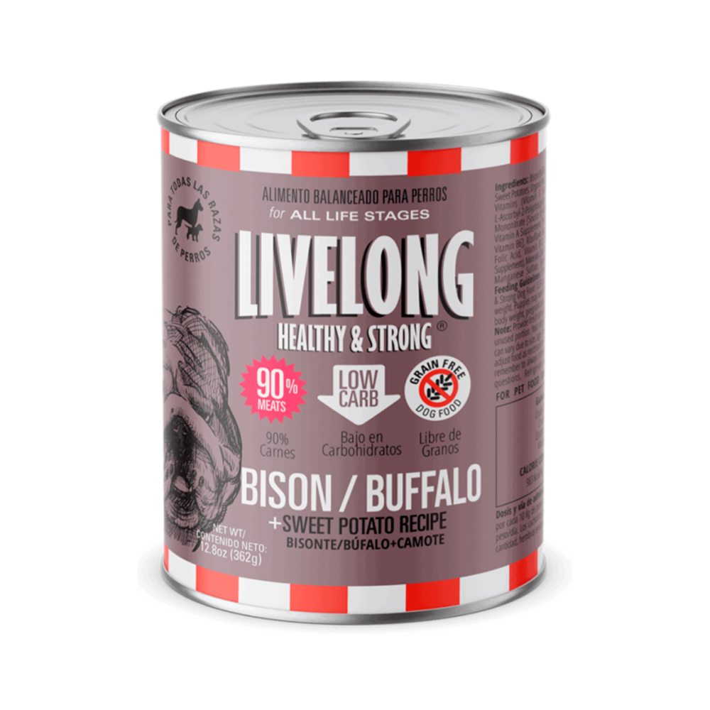 Fórmula natural sin granos con carne de bisonte y camote. Alta en proteína, baja en alérgenos. Latas de 362g. Caja de 12 unidades.