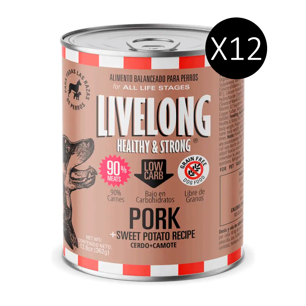 Lata para perros adultos con carne de cerdo y camote. Aporta energía y favorece la digestión. Ideal para dietas libres de granos. Pack de 12.