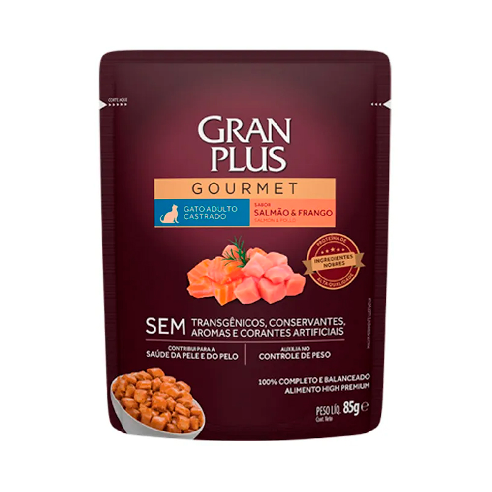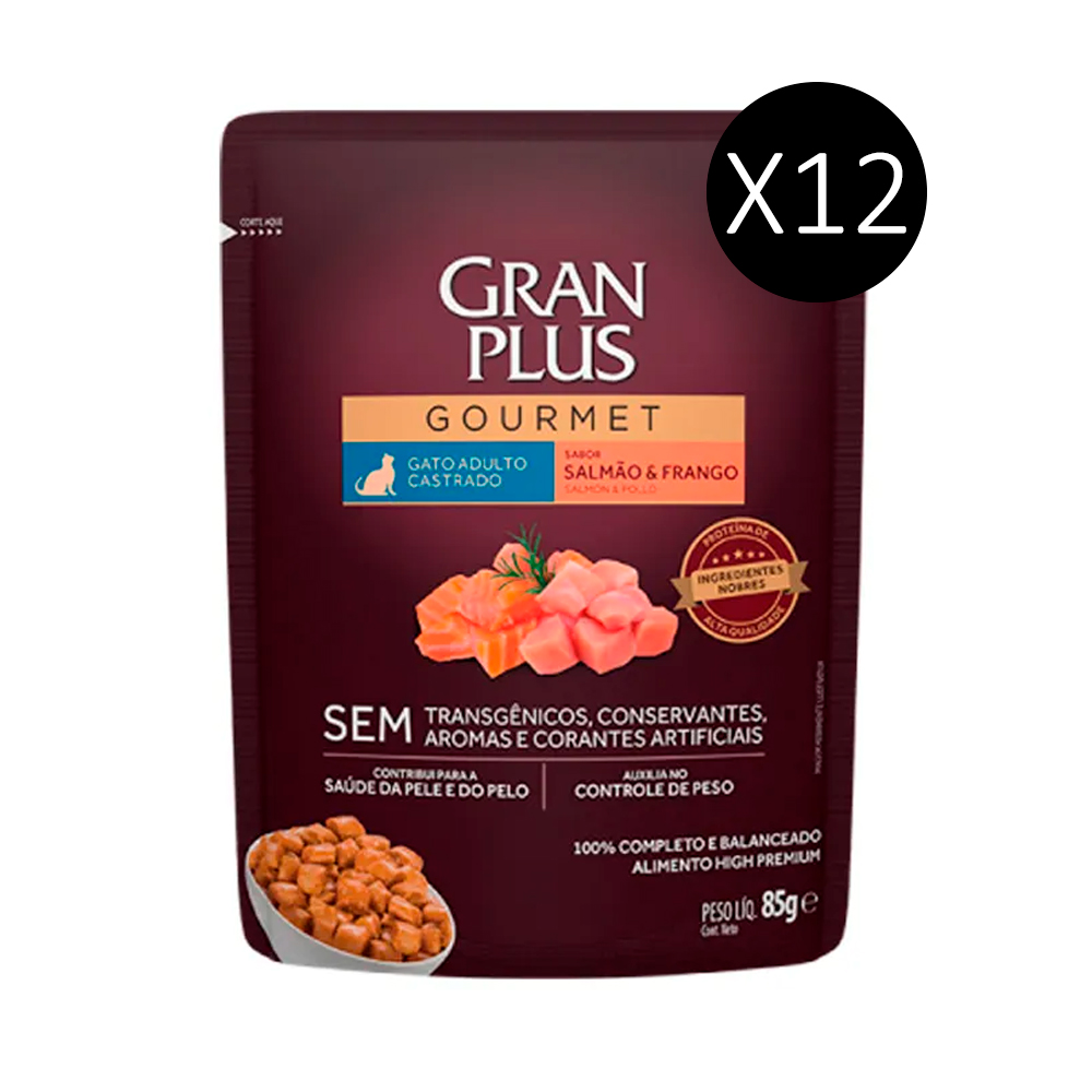 Alimento húmedo con salmón y pollo para gatos castrados. Fórmula balanceada con fibras para la digestión y control de peso. Pack de 12 sobres.