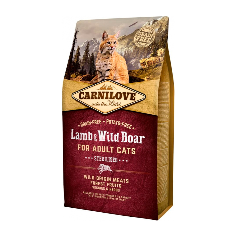 Fórmula SIN GRANO Y SIN PATATA para gatos esterilizados. CARNILOVE Lamb & Wild Boar Cat es un alimento completo para gatos.