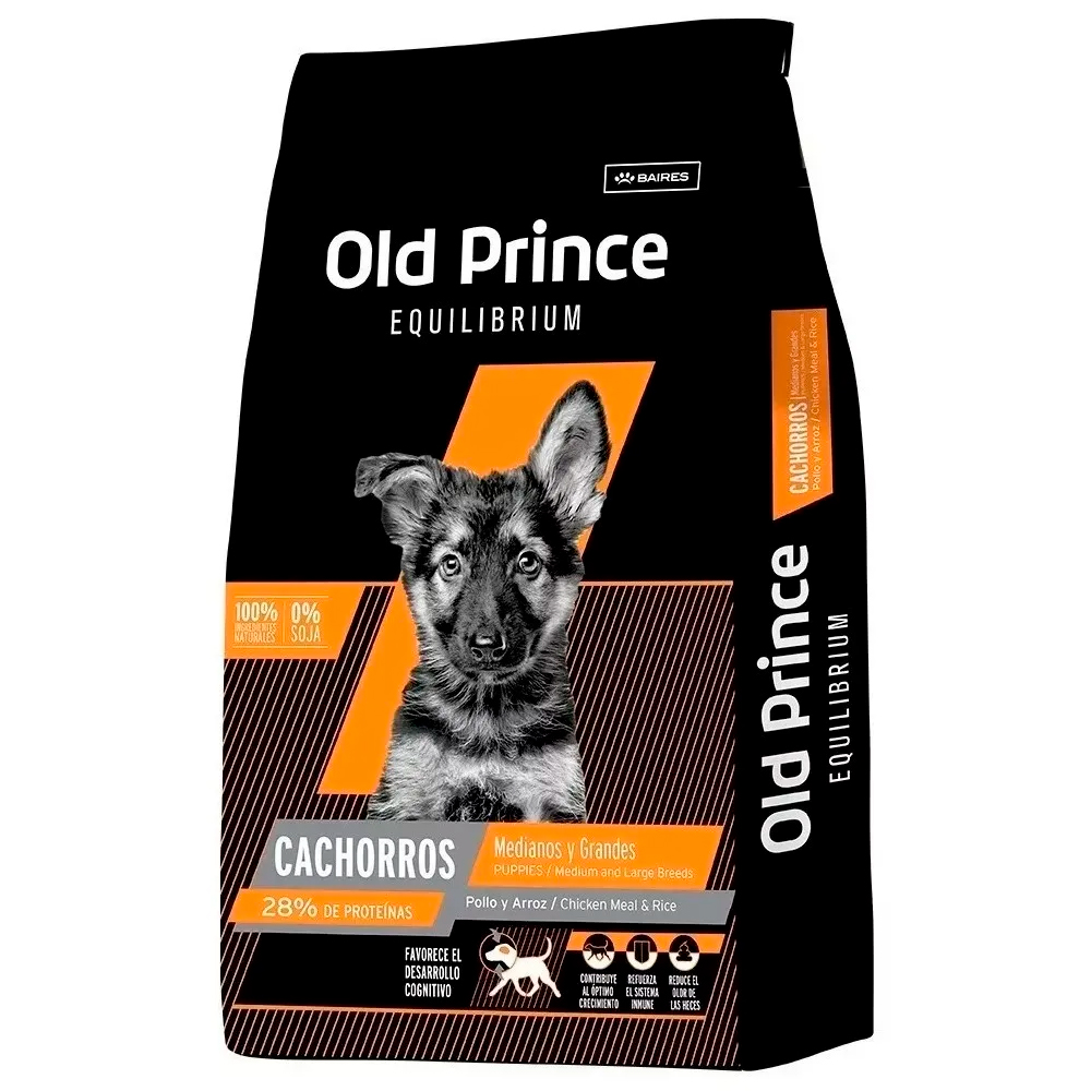 Informacion del Producto: Old Prince Cachorros Medium y Large breeds es un complejo de ingredientes seleccionados según su calidad y beneficios específicos. La fórmula incorpora fuentes innovadoras de sales compuestas y fibras de baja fermentación, como Equilibrium y Fiber, con propiedades beneficiosas para perros y gatos. Este nuevo desarrollo, junto a tecnología de primer nivel aplicada en el proceso productivo, potencia los atributos de esta formulación y fomenta el estado saludable del organismo. Ingredientes: Harina de subproductos de pollo, arroz, gluten de maíz, germen de maíz desgrasado, grasa animal (pollo-cerdo), aceite de pescado, (fuente de omega 3), hidrolizado protéico bovino, pulpa de remolacha (fuente de fructo-oligosacáridos – FOS), fuente de fibra insoluble, levadura de cerveza, zeoliota, sal, acidificante en polvo, extracto de yucca schidigera, manano-oligasacáridos _ MOS. Ficha Técnica: Comida de Mascotas Marca Old Prince Contenido 3 KG