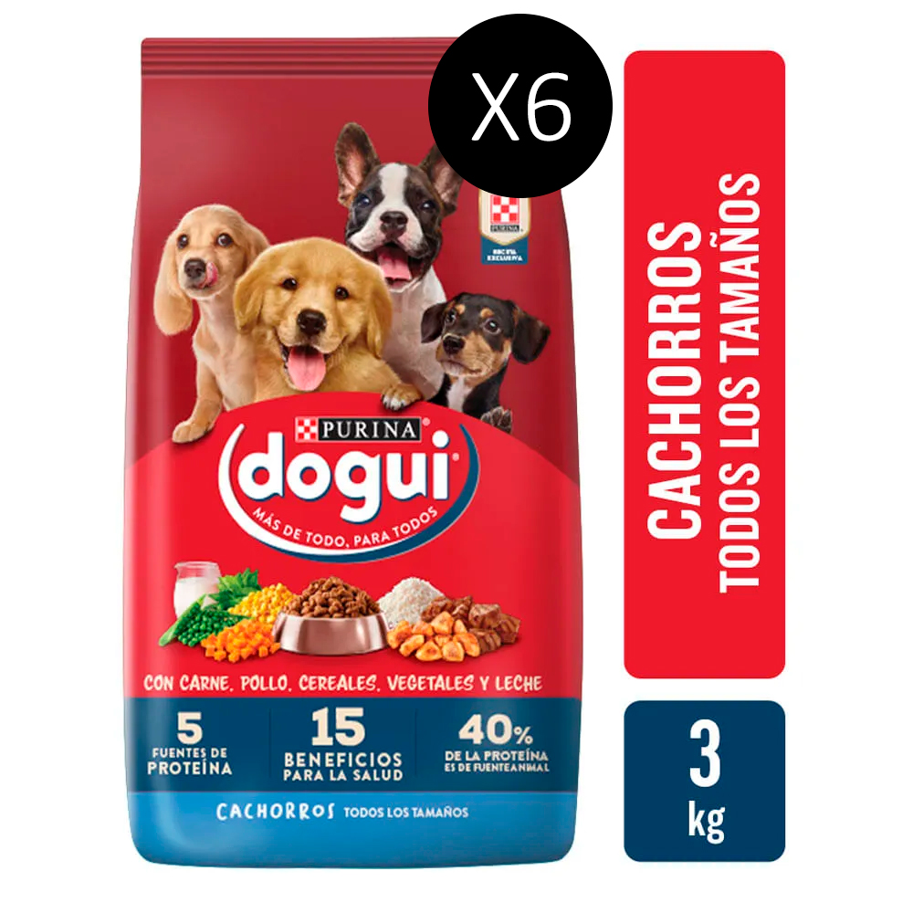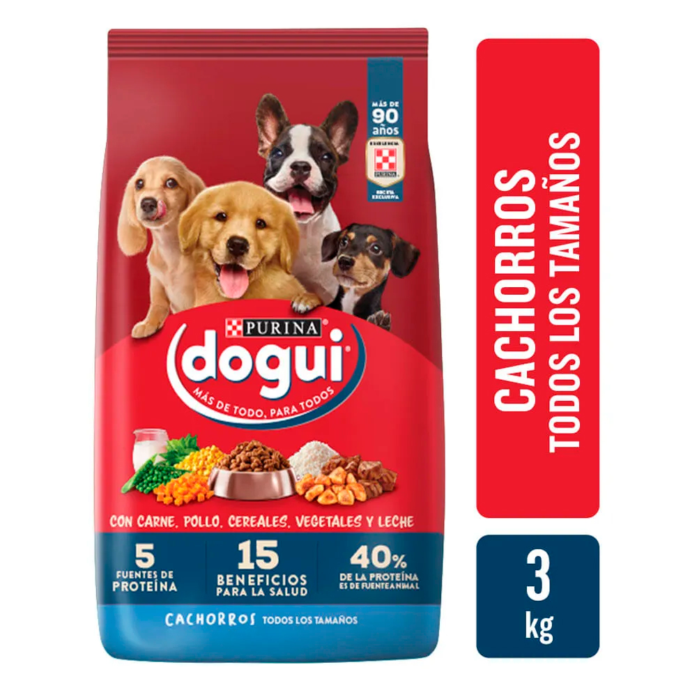 Alimento seco completo y balanceado para cachorros de todas las razas. Formulado con 5 fuentes de proteína (carne, pollo, soja, maíz y leche), conteniendo 40 % de proteína de origen animal. Libre de colorantes artificiales y diseñado para apoyar el crecimiento, digestión y desarrollo saludable del cachorro.