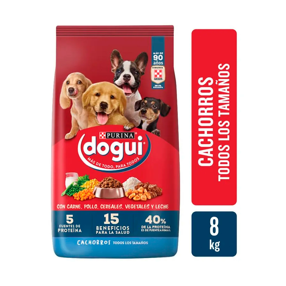 Alimento seco completo y balanceado para cachorros de todas las razas, formulado con 5 fuentes de proteína (carne, pollo, soja, maíz y leche), de las cuales el 40 % es de origen animal. Fortalece el crecimiento saludable, la digestión y el desarrollo general, sin colorantes artificiales. Pack cómodo para mantener la nutrición diaria de tu cachorro.
