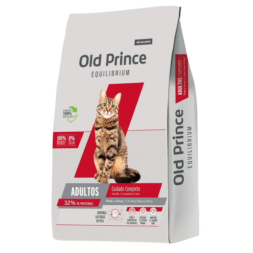 Old Prince Equilibrium Complete Care es un alimento balanceado para gatos adultos de 1 a 7 años de edad. Colabora con el control del peso y la prevención de formación de bolas de pelo. Su aporte de aceites esenciales Omega 3 y 6 fortalece el sistema inmune y estimula la salud de la piel y el pelaje de tu gato. Incluye también taurina, un aminoácido que previene problemas cardiovasculares.