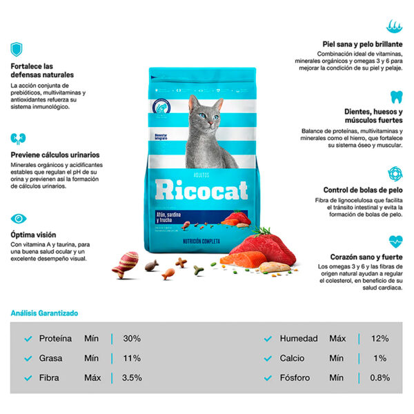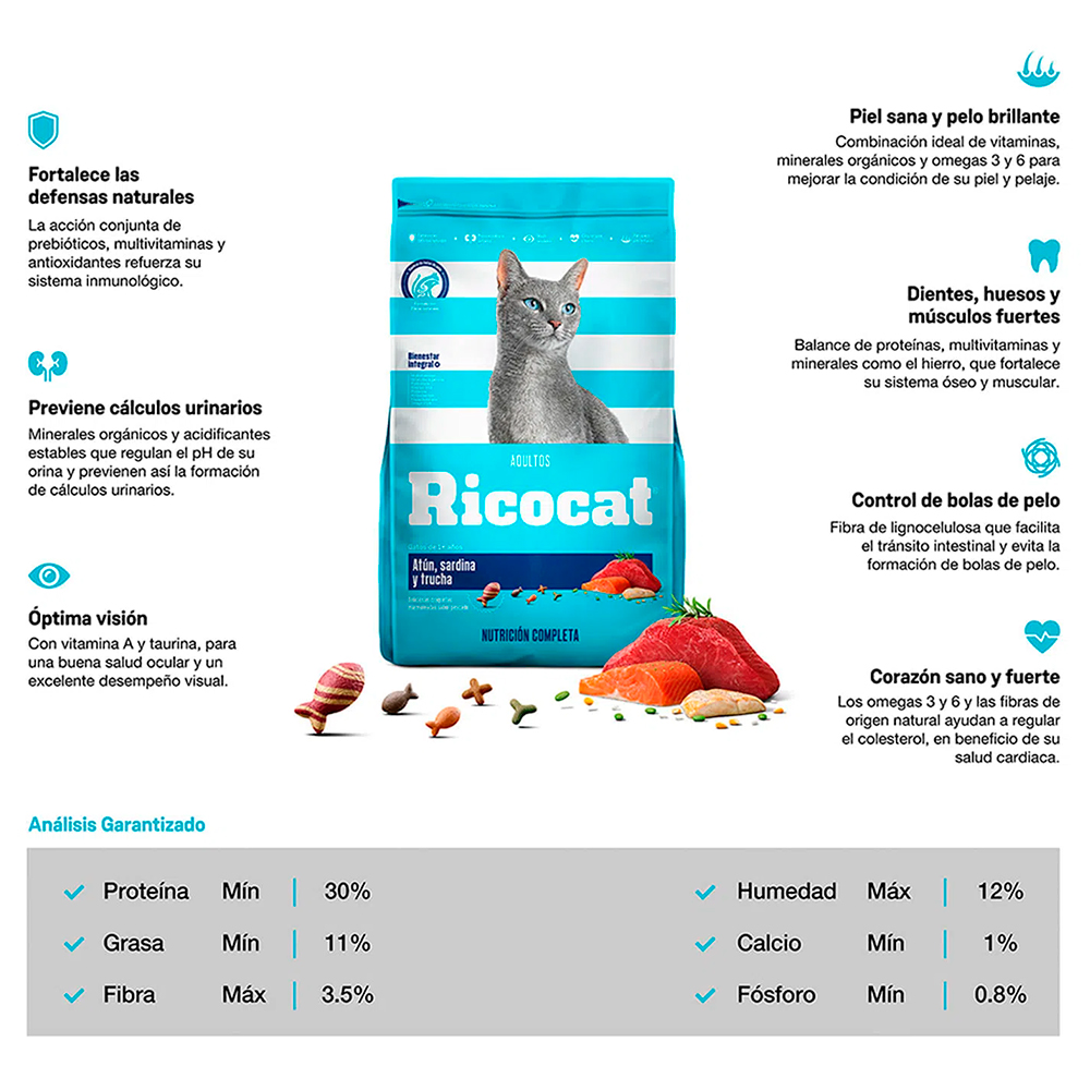 Ricocat cubre las necesidades nutricionales de tu mascota con una mezcla equilibrada de ingredientes.