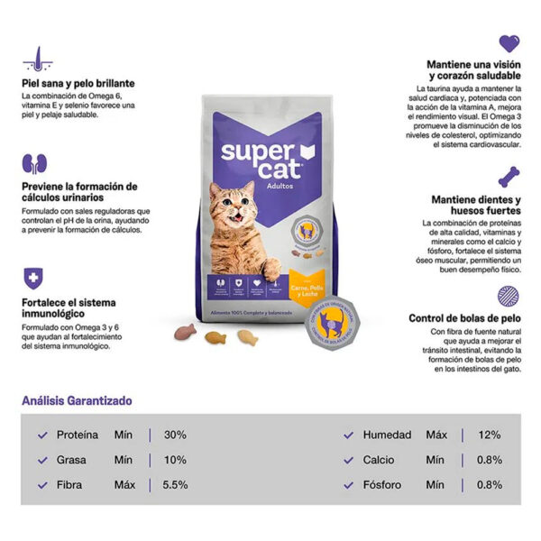 Supercat Carne, Pollo y Leche Adultos es un alimento premium, 100% completo y balanceado, elaborado bajo los estándar exigidos por la AAFCO.