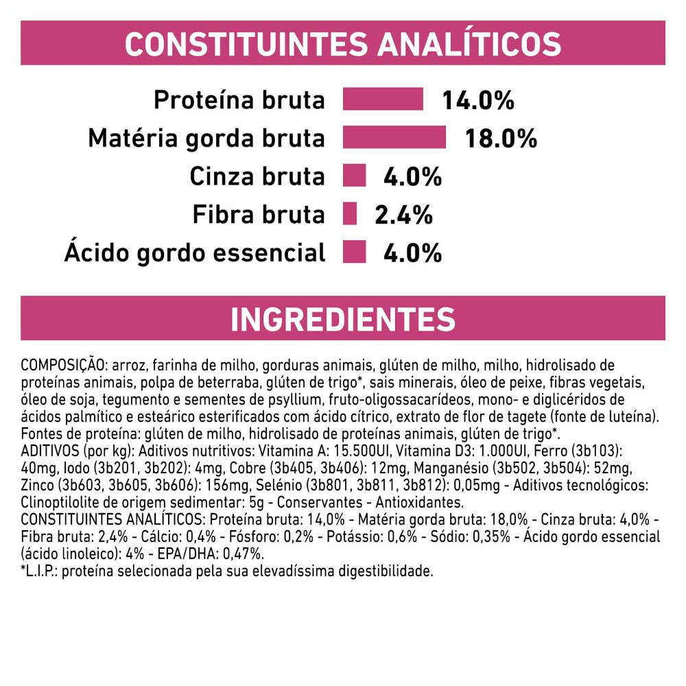 El contenido energético adaptado de esta fórmula reduce el volumen de la ración, lo que ayuda a compensar la pérdida de apetito en algunos perros.
