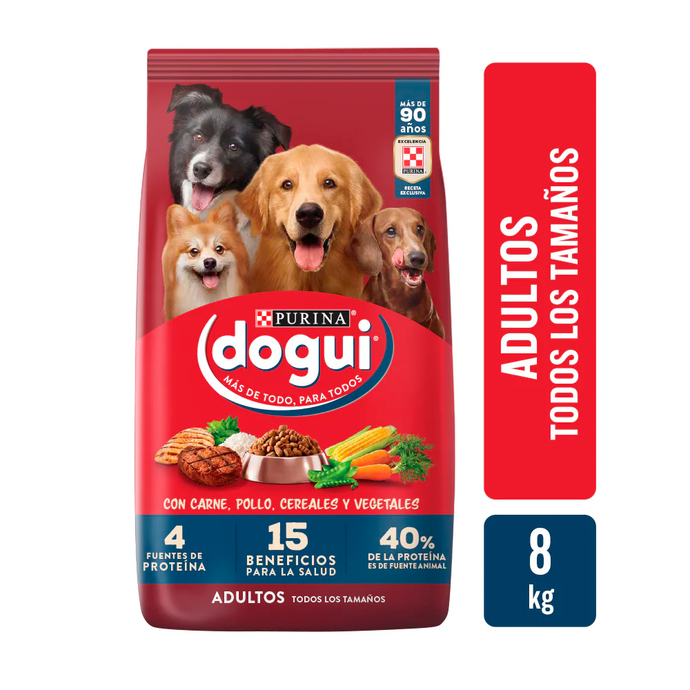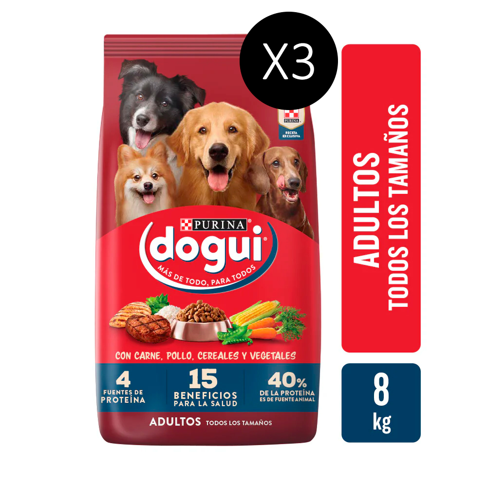 Pack de 3 bolsas de Purina Dogui Adultos 8 kg c/u. Alimento seco completo y balanceado para perros adultos, con sabor a carne, pollo y vegetales. Contiene proteínas de origen animal y vegetal, vitaminas, minerales y fibra para una digestión saludable, músculos fuertes y energía diaria. Ideal para todas las razas.