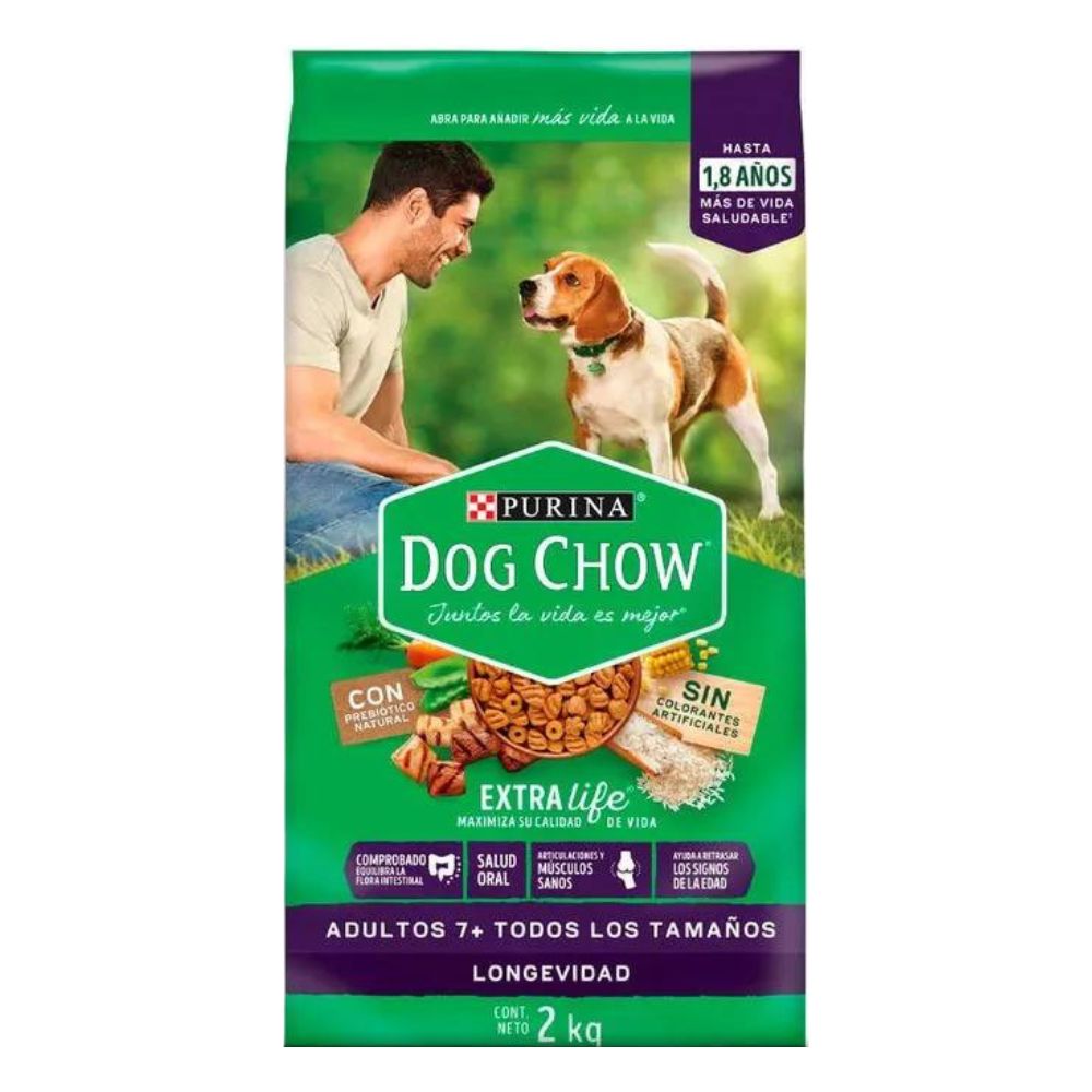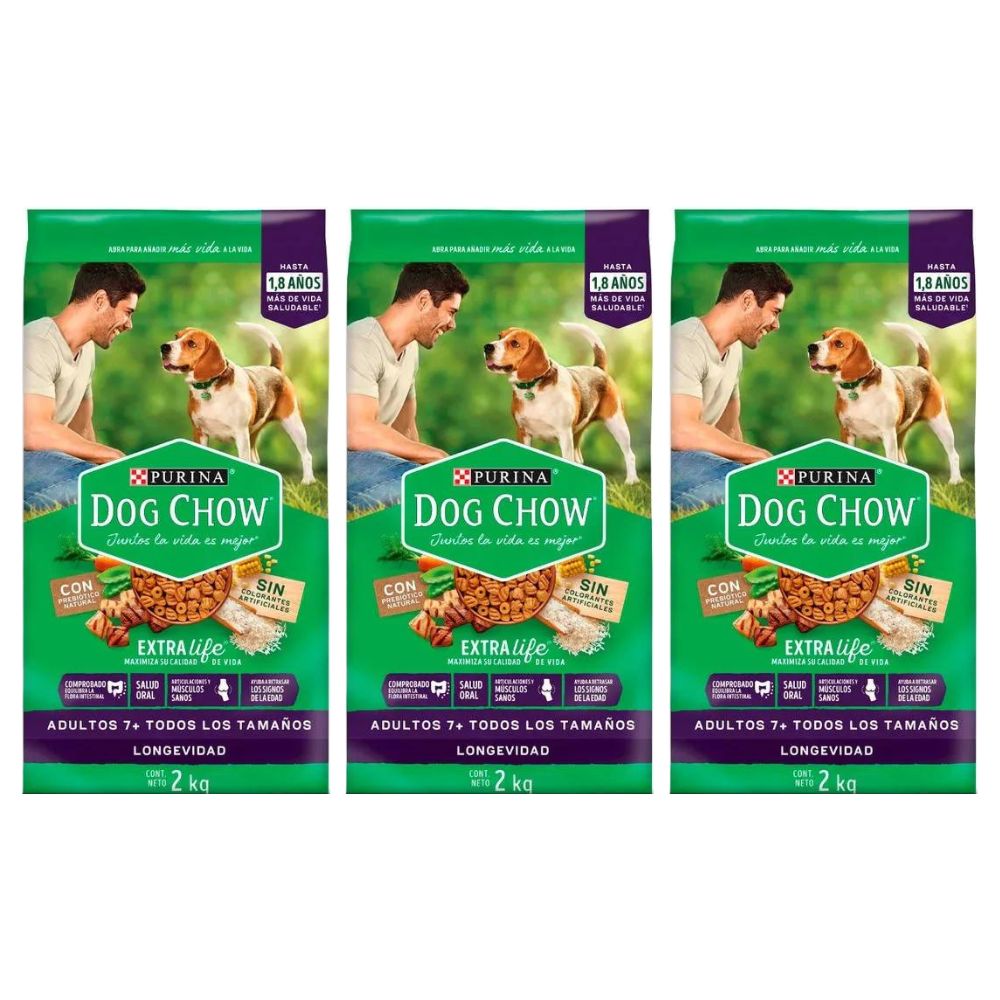 menos cantidad del alimento anterior y más cantidad de PURINA® DOG CHOW® Longevidad Adultos 7+ Todos los Tamaños, hasta que sólo use este producto, de manera que el cambio esté completo de 7 a 10 días.