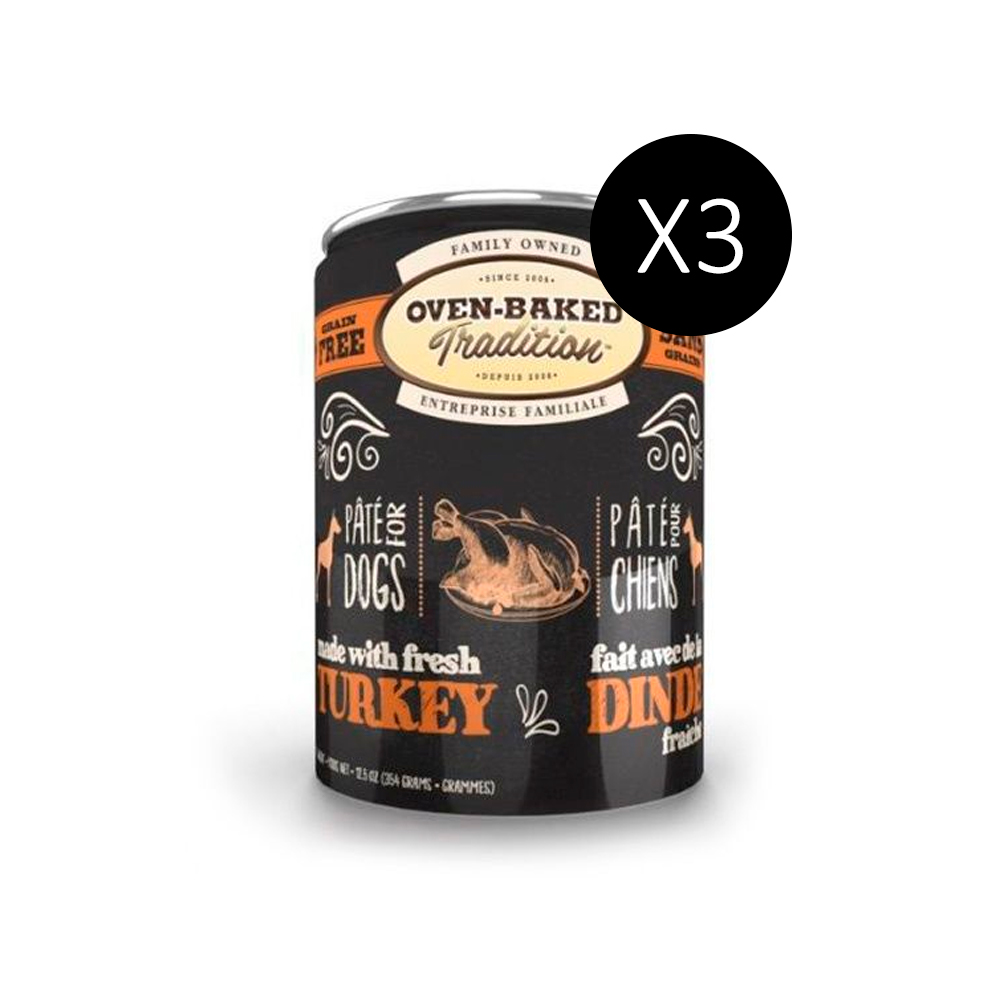 Paté húmedo natural sin cereales, con pavo fresco como fuente de proteína de alta calidad. Apto para perros con alergias o dietas especiales. Pack de 3 latas de 354g.