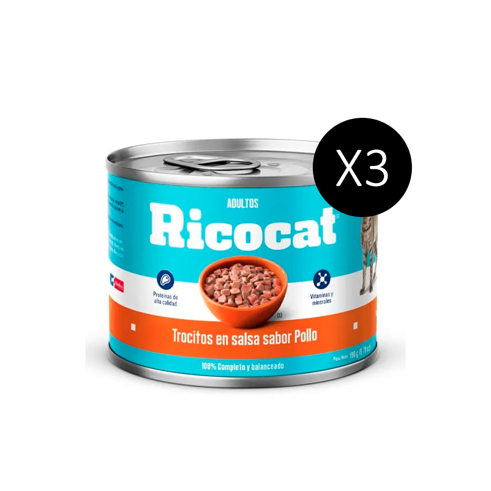 Trocitos suaves de pollo en salsa sabrosa. Hidrata y aporta proteína de alta calidad. Presentación: 3 latas de 190g.