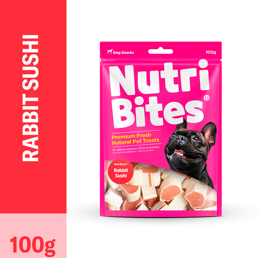 Delicioso snack de conejo en formato sushi. Fuente alternativa de proteína ideal para perros alérgicos. Bolsa de 100g.