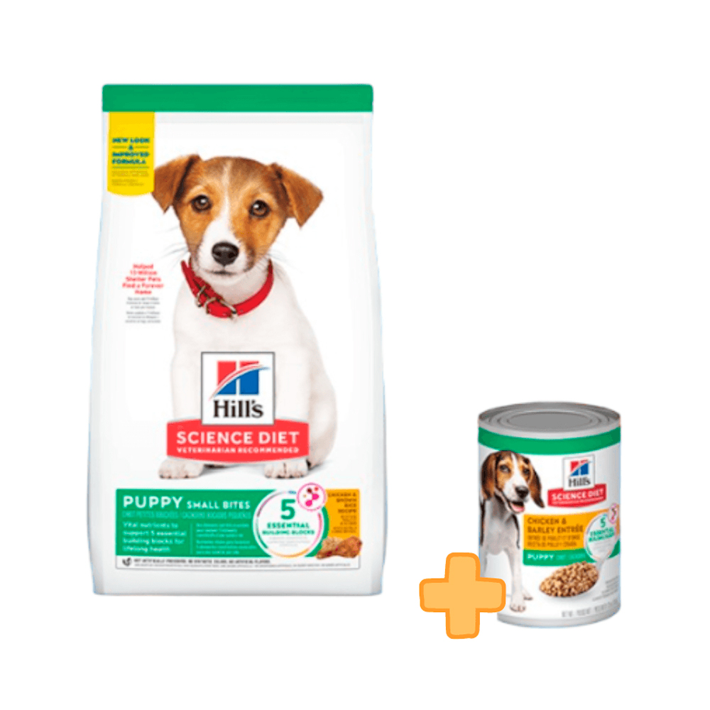 Pack para cachorros de raza pequeña: alimento seco de fácil masticación + lata 369 g con receta húmeda nutritiva.