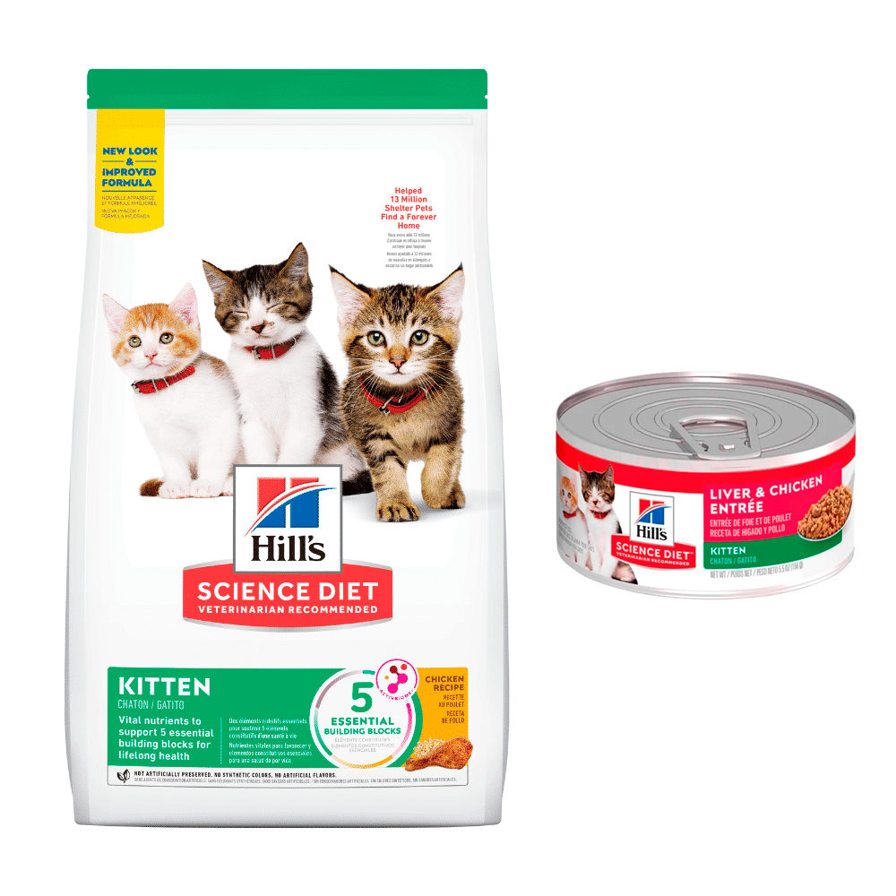 Pack promocional con alimento seco Hills para gatitos y una lata de comida húmeda. Nutrición completa y balanceada desde los primeros meses.