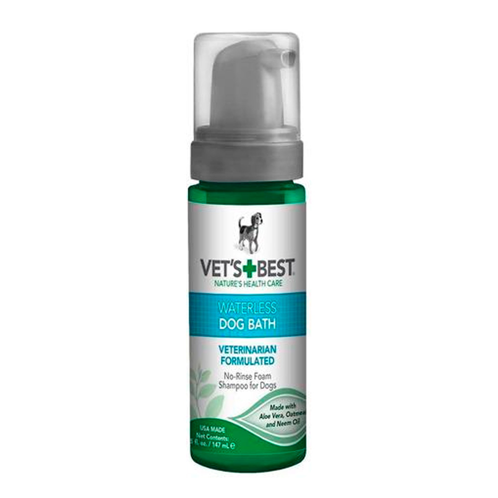Vet’s Best Waterless Dog Bath es un shampoo para perros en espuma sin enjuague que actúa como un limpiador calmante y humectante para la piel y el pelaje de su perro entre baños. El champú Waterless Dog está formulado por veterinarios con ingredientes naturales (aloe vera y aceite de neem) y tiene una fragancia relajante y calmante. Para uso con perros de 12 semanas o más, y no afectará a los productos tópicos para el control de pulgas. La solución perfecta cuando no hay agua disponible o cuando hace frío.