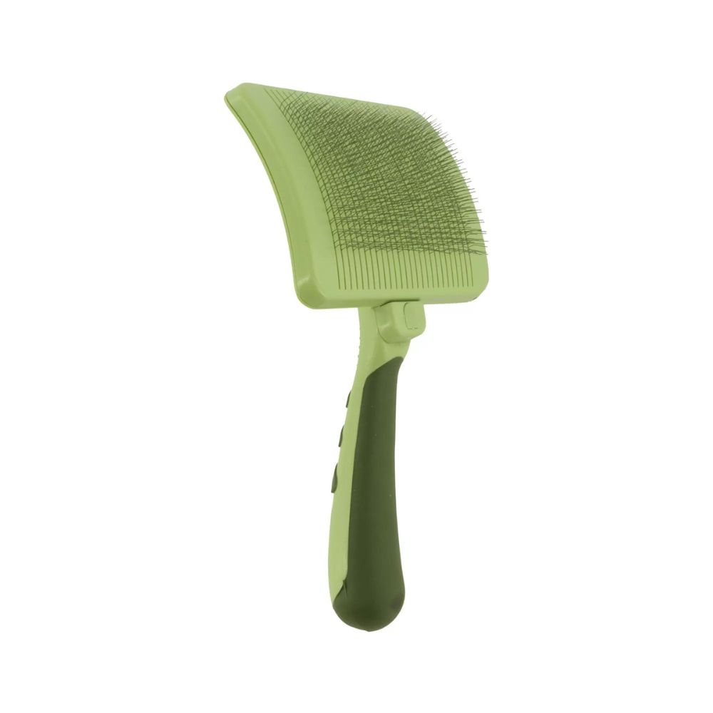 Cepillo tipo slicker con sistema autolimpiante para facilitar la remoción del pelo. Ideal para perros y gatos de pelaje medio a largo.