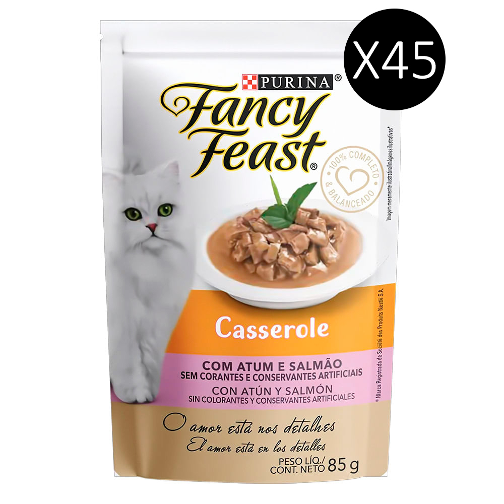 Receta húmeda premium con atún y salmón. Textura gourmet y alta palatabilidad. Pack de 45 sobres.