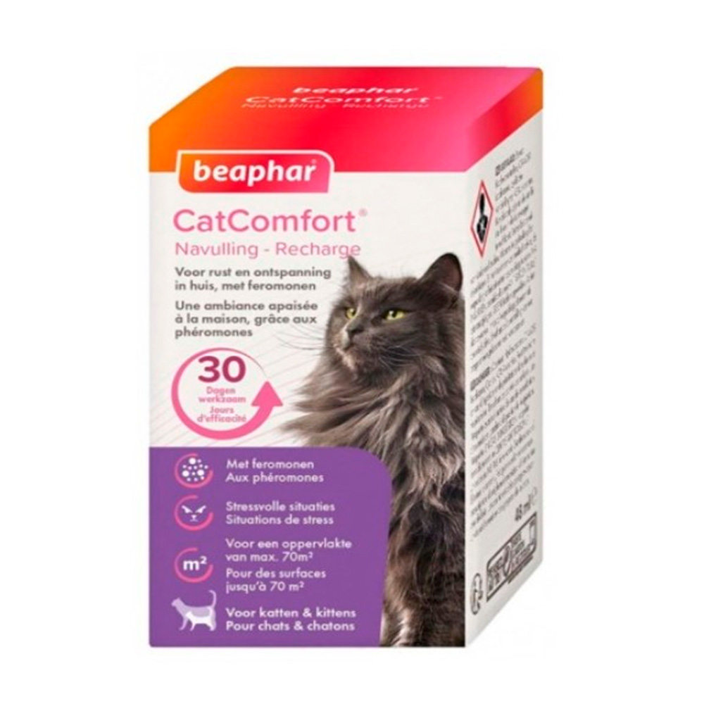 Beaphar CatComfort® contiene una copia de la feromona facial para gatos producida de forma natural, que brinda un mensaje continuo y tranquilizador para que los gatos sepan que es un área segura para ellos. Cada recarga es efectiva por hasta 30 días. Comfort® contiene una copia de la feromona facial para gatos producida de forma natural, que brinda un mensaje continuo y tranquilizador para que los gatos sepan que es un área segura para ellos. Cada recarga es efectiva por hasta 30 días.