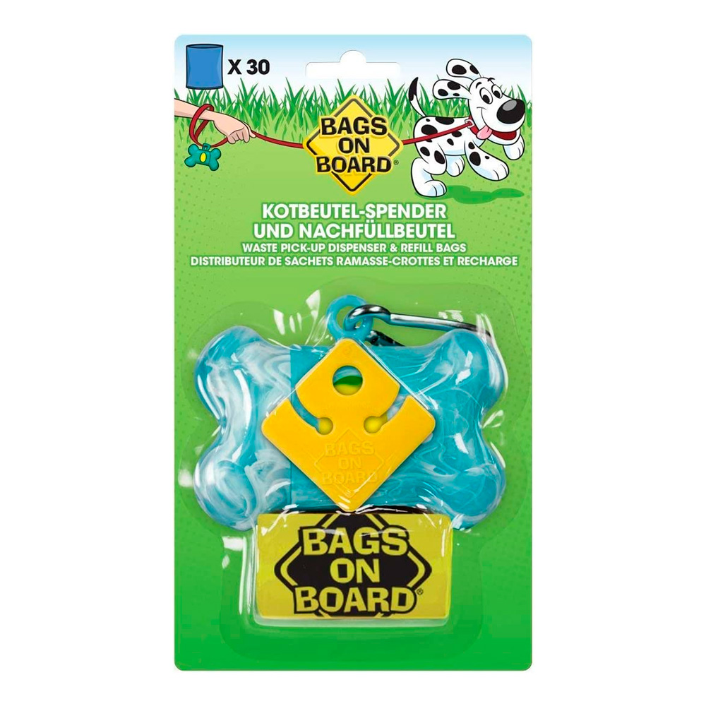Los dispensadores de Bags on Board se acoplan a cualquier correa estándar o retráctil, por lo que siempre tendrás una bolsa para las cacas cuando la necesites.
